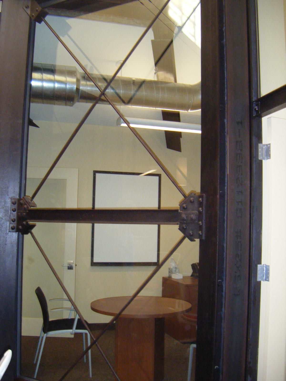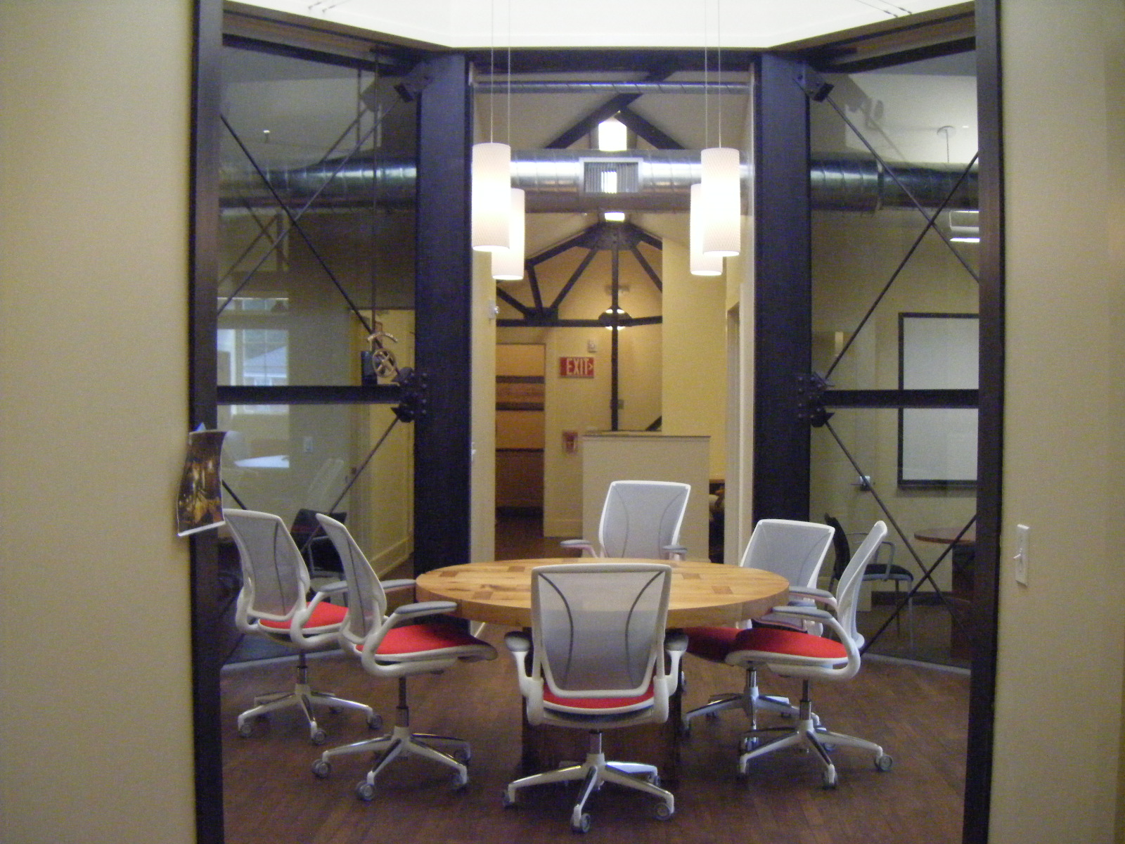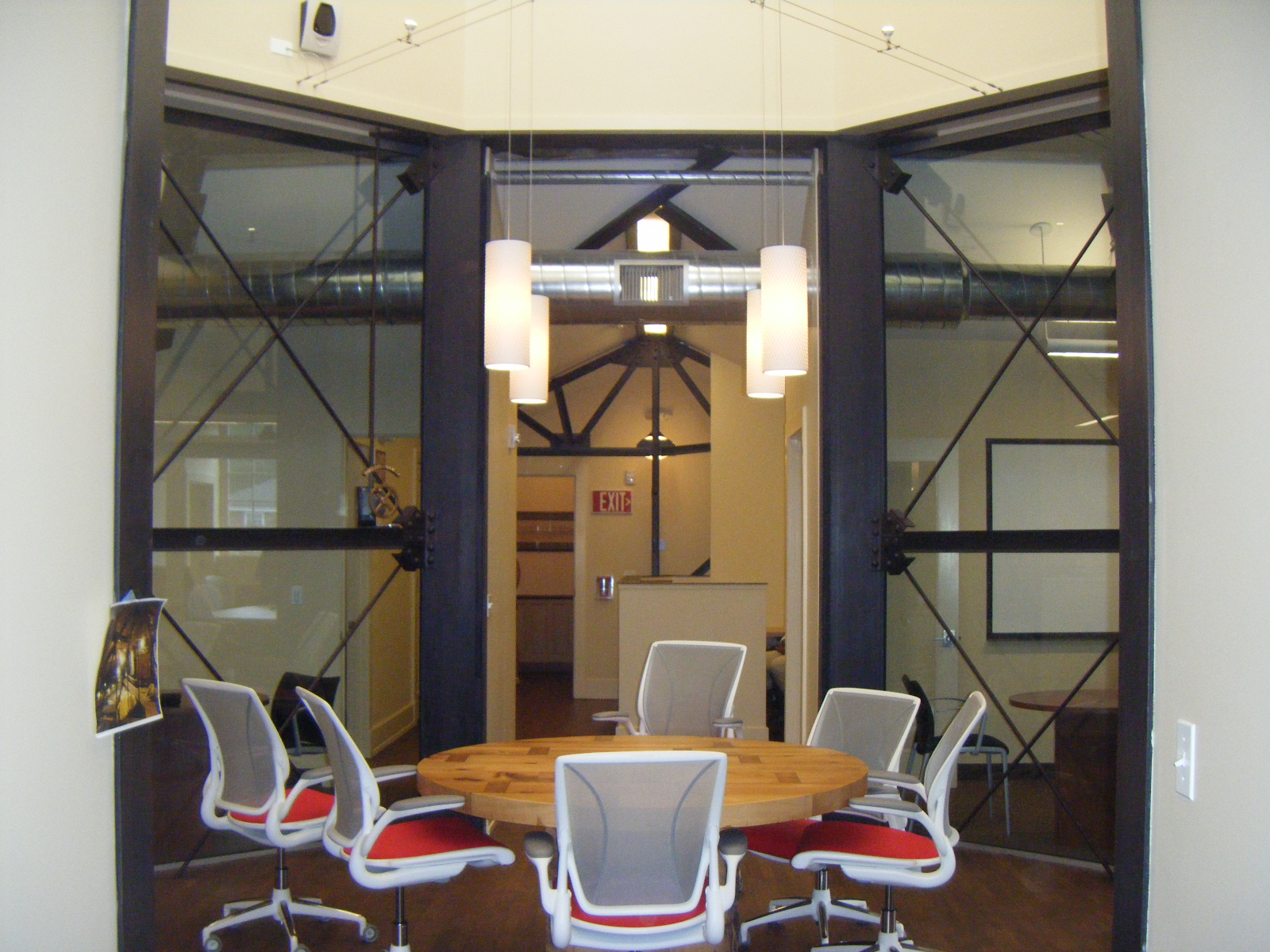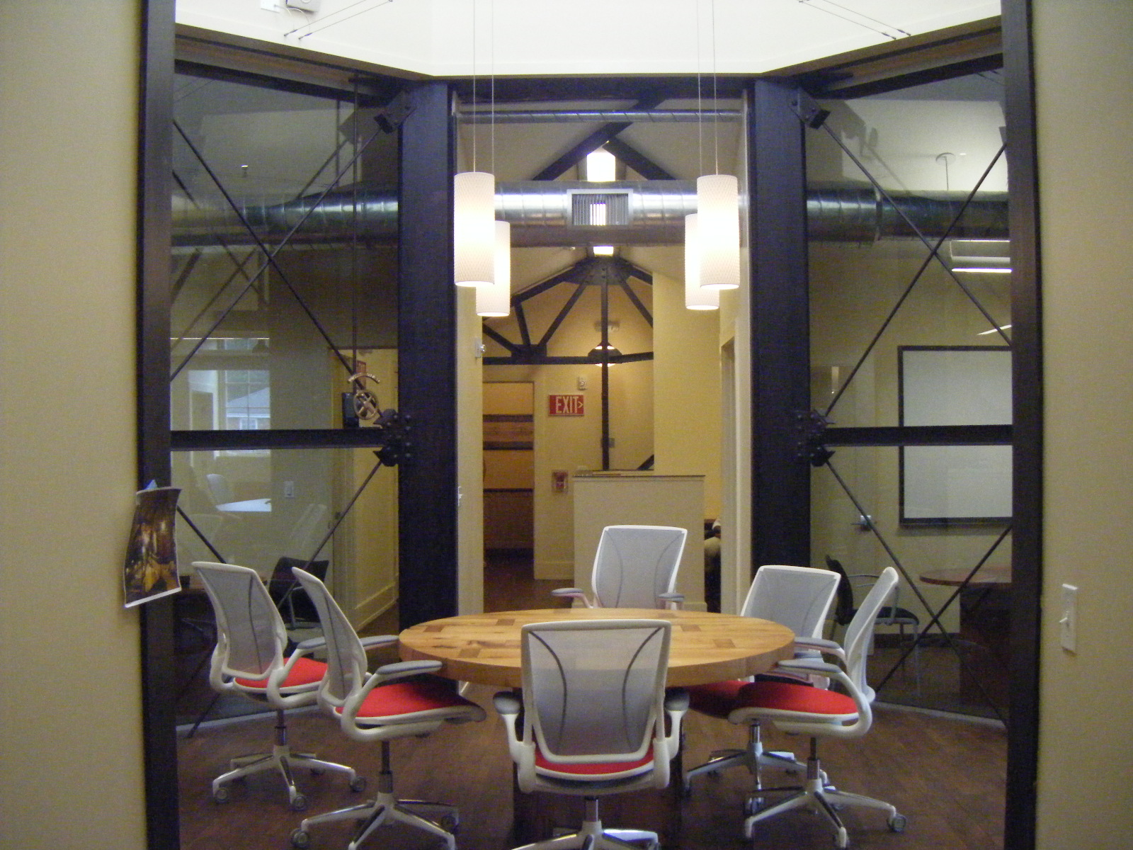 Meeting room, for use by all tenants, with an original wrought iron pendant lamp, retrofitted with LED light bulbs and is a table fabricated from old beams. Another architectural detail still remains in the new offices 20-foot walnut arch at the end of the hall.