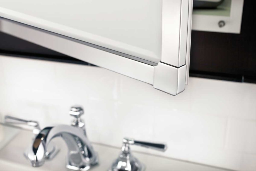 Embracing the beauty of the Lexington series frame, four hand-crafted decorative corner finials soften the look of this series. This transitional framed mirrored medicine cabinet that will virtually complement any decorative scheme. This framed medicine cabinet comes standard with Flat mirror. An upgrade is available for a 3/4" Bevel mirror. Polished Chrome and Polished Nickel plated frames highlight the beauty of this series. Satin Brass, Iron Black (Matte), Brushed Nickel complete the finish options to complement your bathroom. This frame is available with standard flat mirror or 3/4" beveled mirror upgrade shown above.