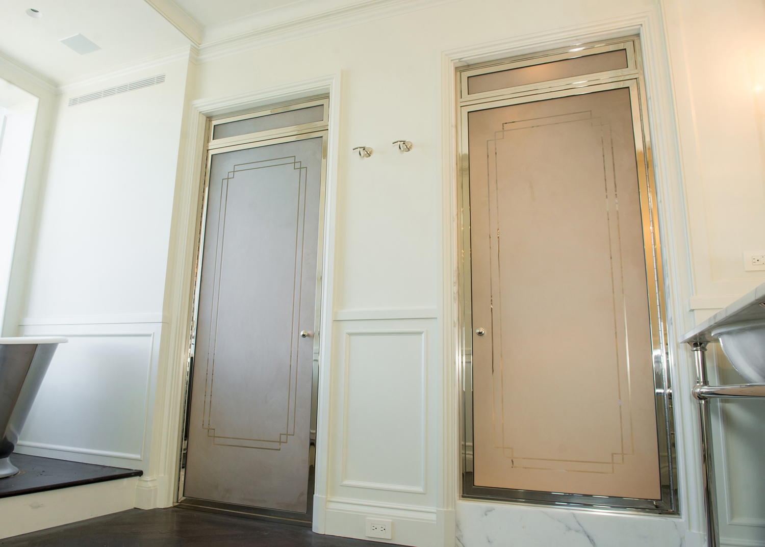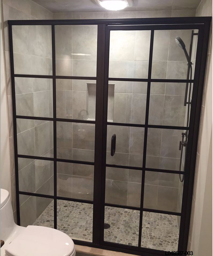 Framed shower enclosure traditionally feature a metal frames surrounding panels of tempered, textured or laminated architectural glass. The metal on the frame enclosure capture all edges of the glass such as top, bottom, sides and joints, parts of the partition, leaving no glass edge exposed. The moving parts such as door are fastened with stainless steel pivot or piano hinges.
