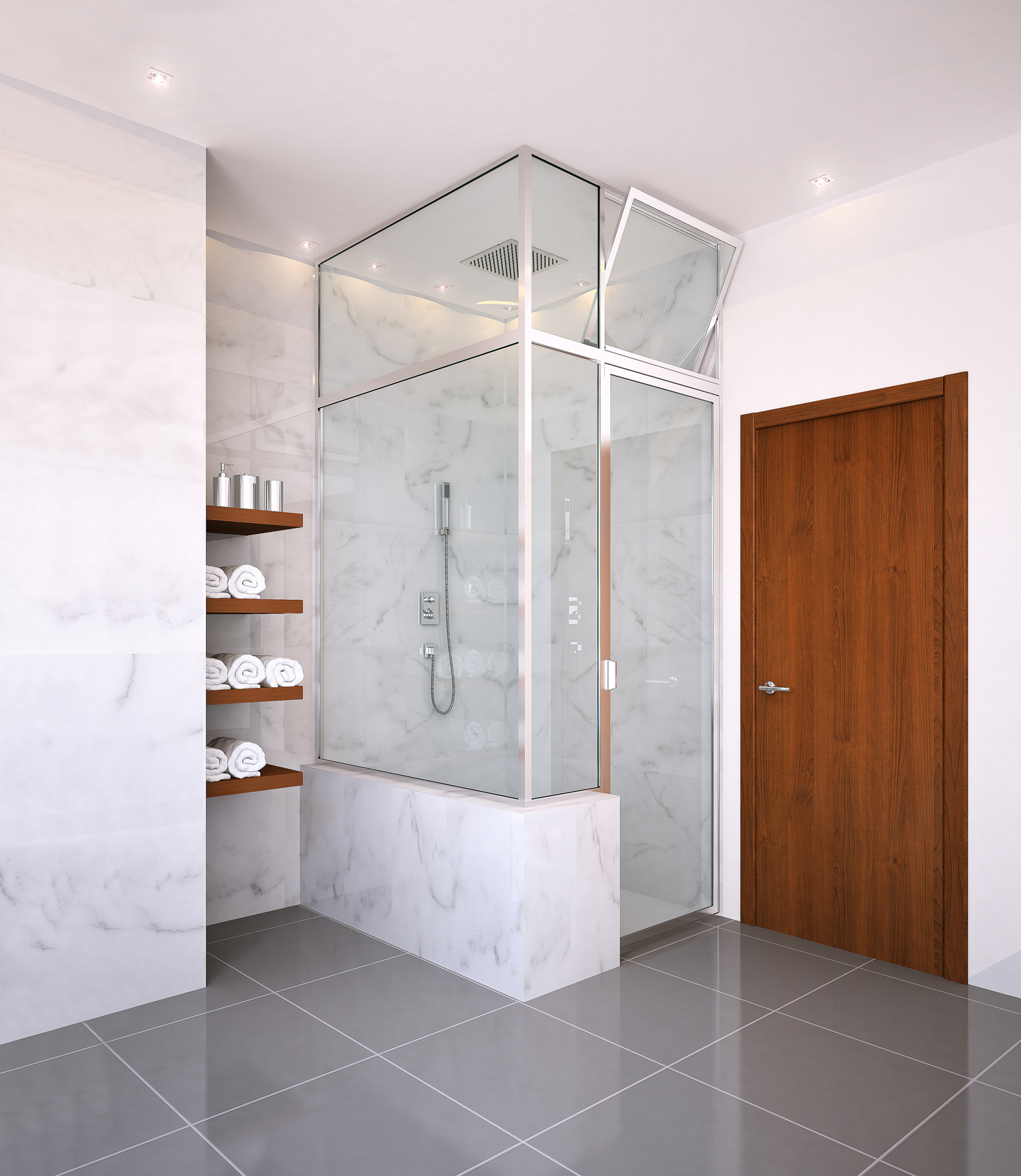 Luxury heavy glass that used for this type of frameless enclosure is usually fastened by specifically designed hardware such as clamps and hinges to hold the glass panel without using any framing around it.