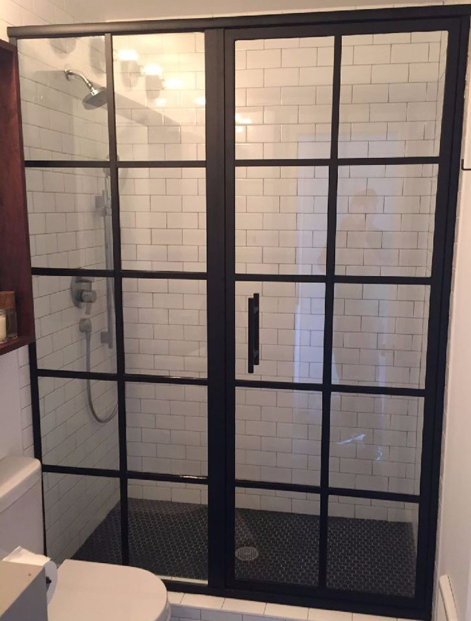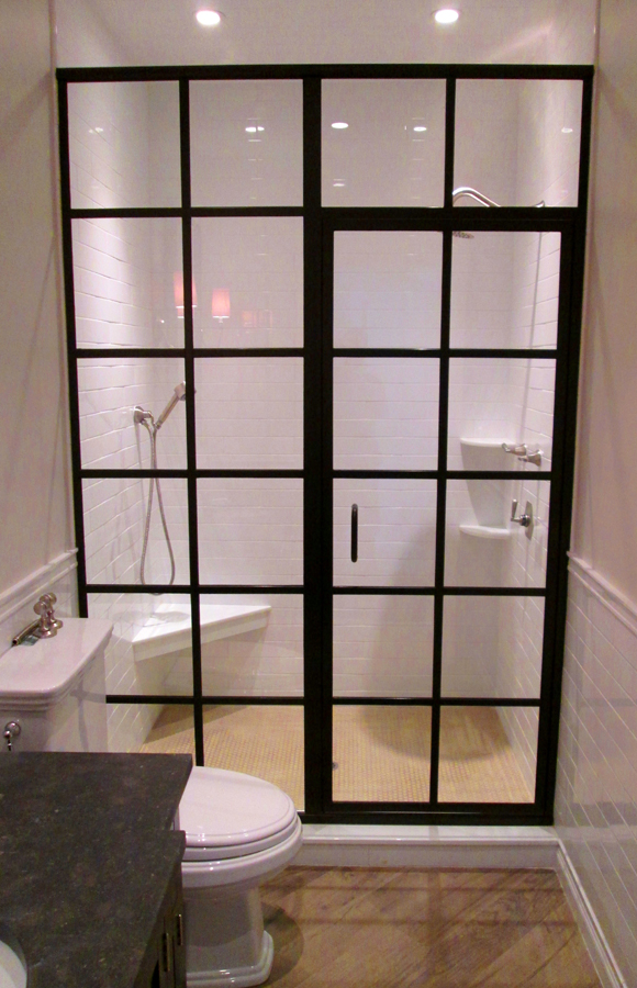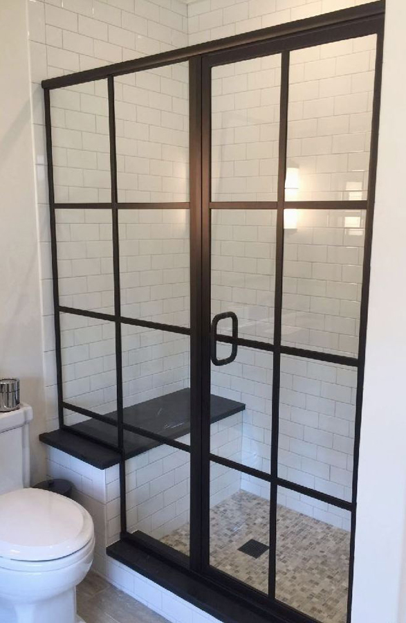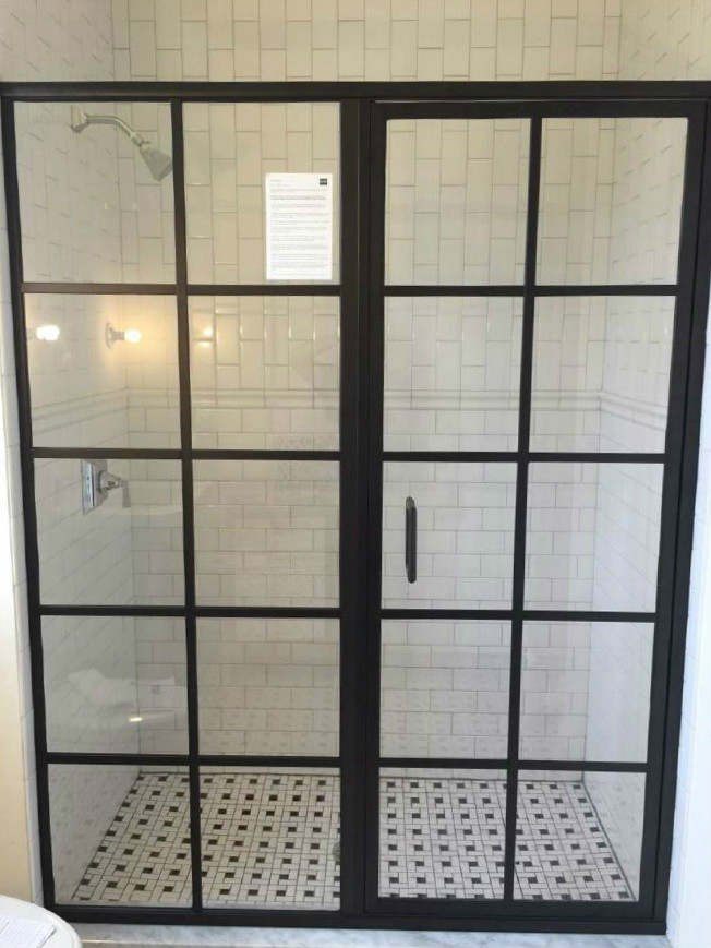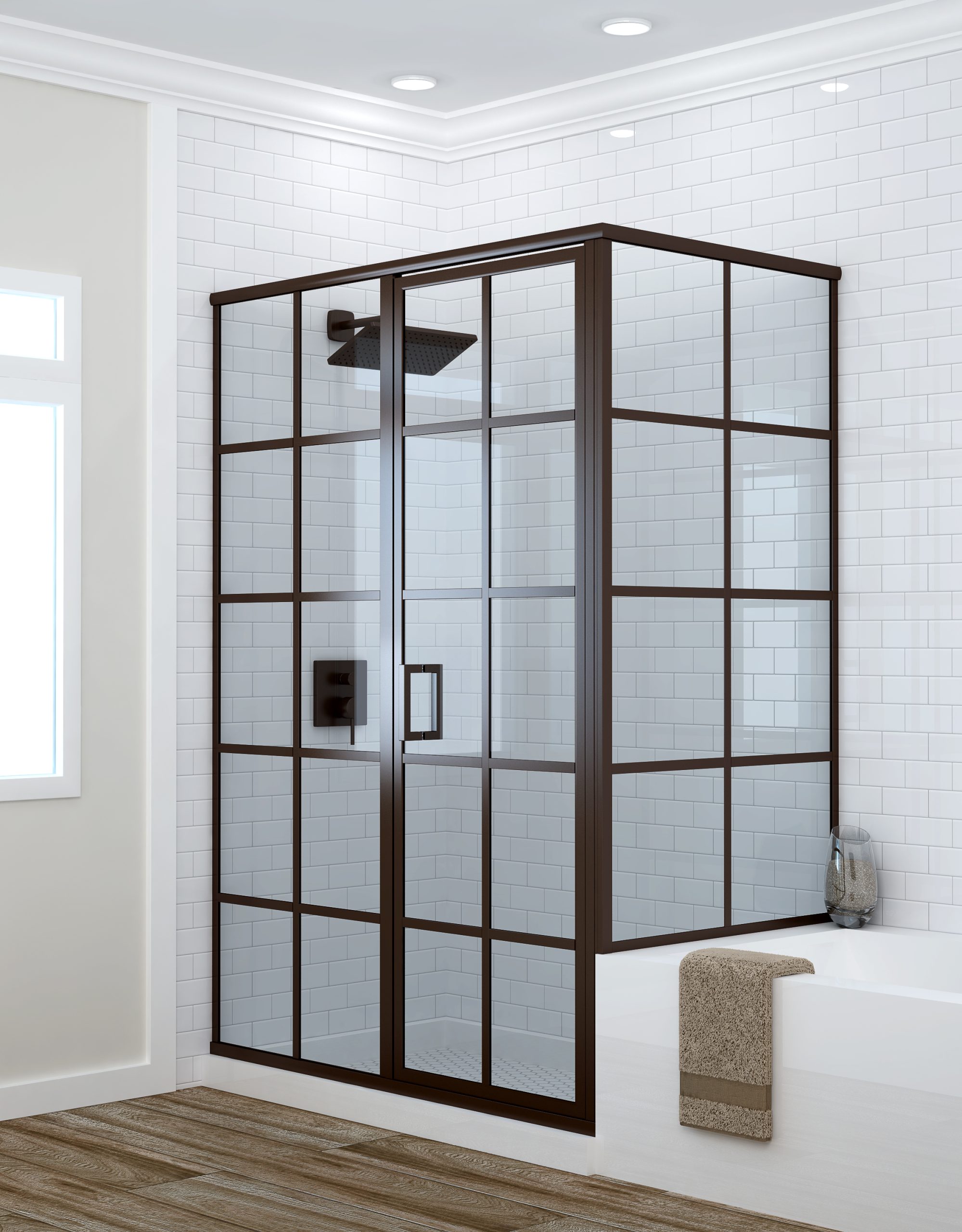GlassCrafters' Metropolis Series™ framed shower doors, influenced by Tudor window architecture, is fabricated with symmetrical, geometric, grid pattern.